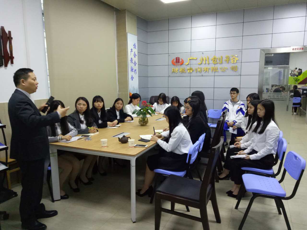 为了打造商贸学校电算化专业特有“教、学、做”一体化教学场所,广州市商贸职业学校与广州创裕财税咨询有限公司共同成立了诚道会计工作室。为了适应职业教育发展规律的要求,积极探索创新校企合作的新模式,诚道会计工作室利用财务咨询公司的代理记账资源,通过“做中教、学中做”的一体化教学模式,由专业教师与企业专家作为双导师,指导学生们在工作室里进行真帐实操。