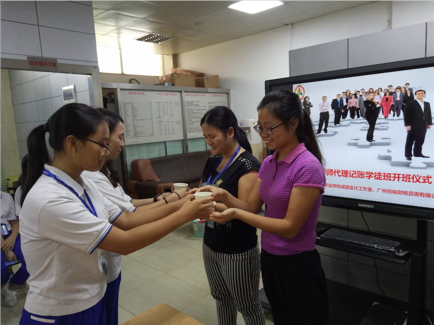 一批优秀的会计专业学子,以优异的成绩顺利通过了会计从业资格考试,积极报名参加诚道学徒班,通过指导老师的筛选,21名学生于2016年9月23日在诚道会计工作室进行了拜师仪式。肖英姿部长寄予了深切的期望,希望同学们珍惜学习的机会,积累经验,培养职业素养,为将来就业打下良好基础。谢珊娥同学代表学徒们向财经部专业教师甘秋丽老师及创裕财税财务经理黄佩珊老师行拜师礼。创裕财税负责人李贵仁先生、秦兵伟先生、以及师姐李丽清小姐对学徒们的到来表示了热烈的欢迎。